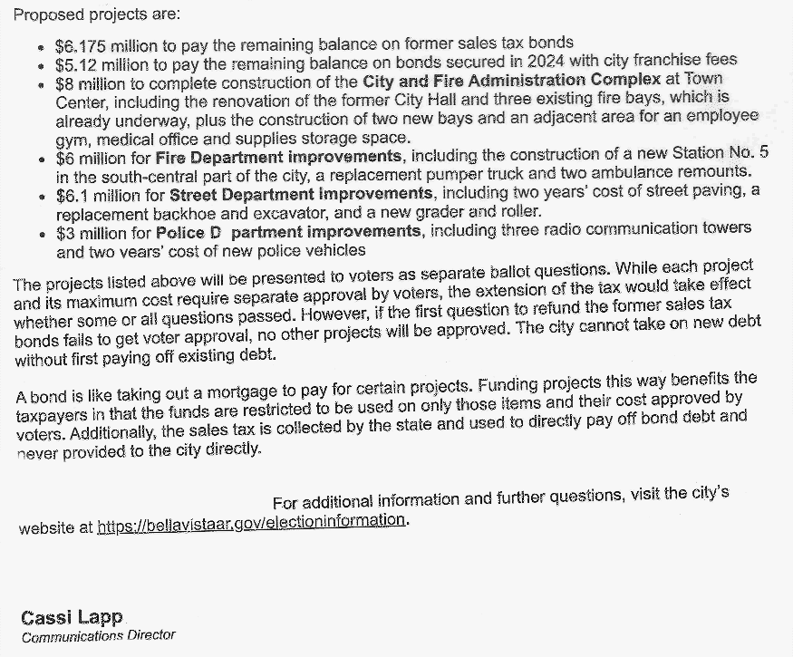 This will pay off existing debt, fund major long term capital projects, free up current funds to allow the city to prepare for future needs, and broaden the tax burden to include those visiting Bella Vista.